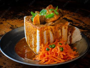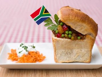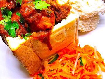 A rich and spicy Durban style curry with chunks of chicken, potatoes, tomato and onion in a rich curry gravy. All served in a house made bread bowl with a carrot salad. Gluten free option of curry over rice available.